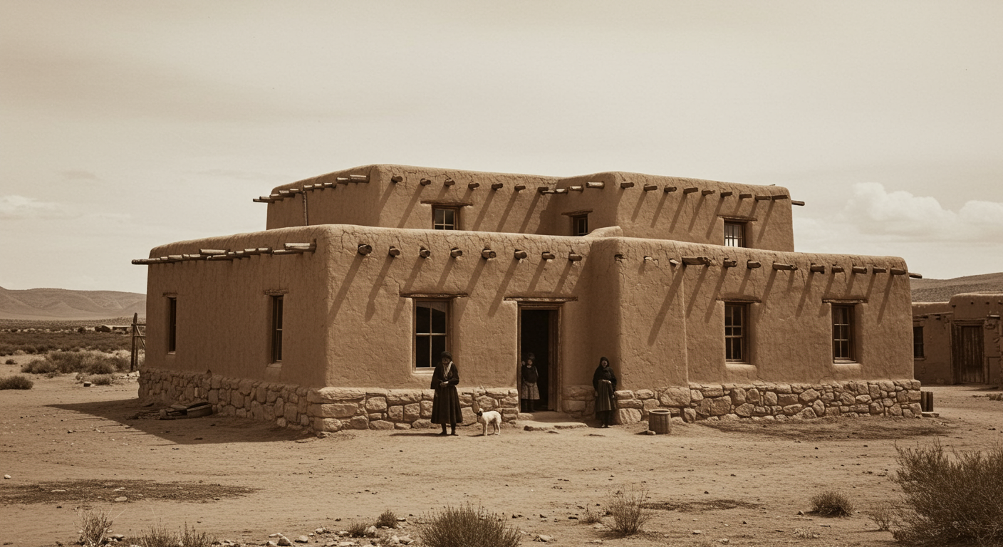 "For over a century, the house across the street from the San Miguel Chapel has been known as the oldest house in the city. While the structure is labeled the 'oldest building' on the J. J. Stoner Bird’s Eye View of the City of Santa Fe, N.M. 1882, its actual age is not known. While tree-ring specimens taken from wooden vigas date to about 1740–67, portions of the lower walls of one room in the house are made of puddled adobe, an indigenous building technique that predates the adobe mud bricks introduced by Spanish colonists. Even though its age remains debatable, it is a tourist destination that demonstrates how long tourism has been an important part of Santa Fe’s economy.